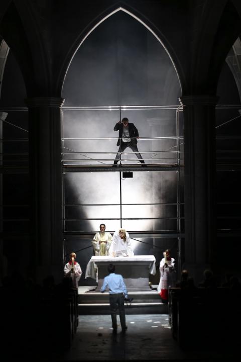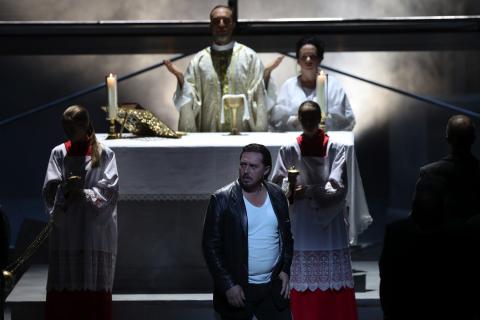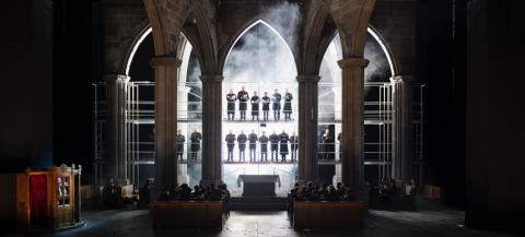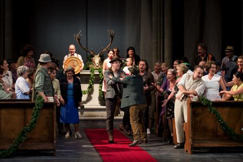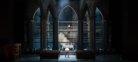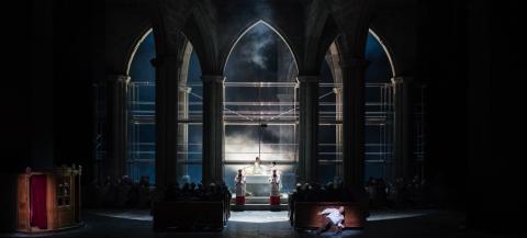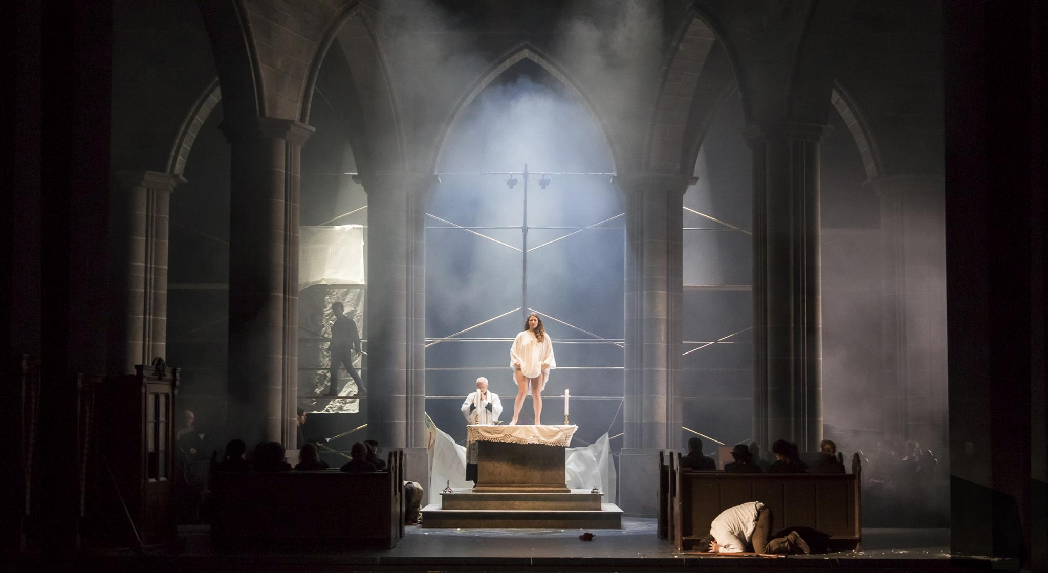 „Der düstere Kirchenraum mit Beichtstuhl, Chorgestühl und Altartisch gibt den Takt der Inszenierung vor: Glaube, Aberglaube und Tradition im Widerstreit.“